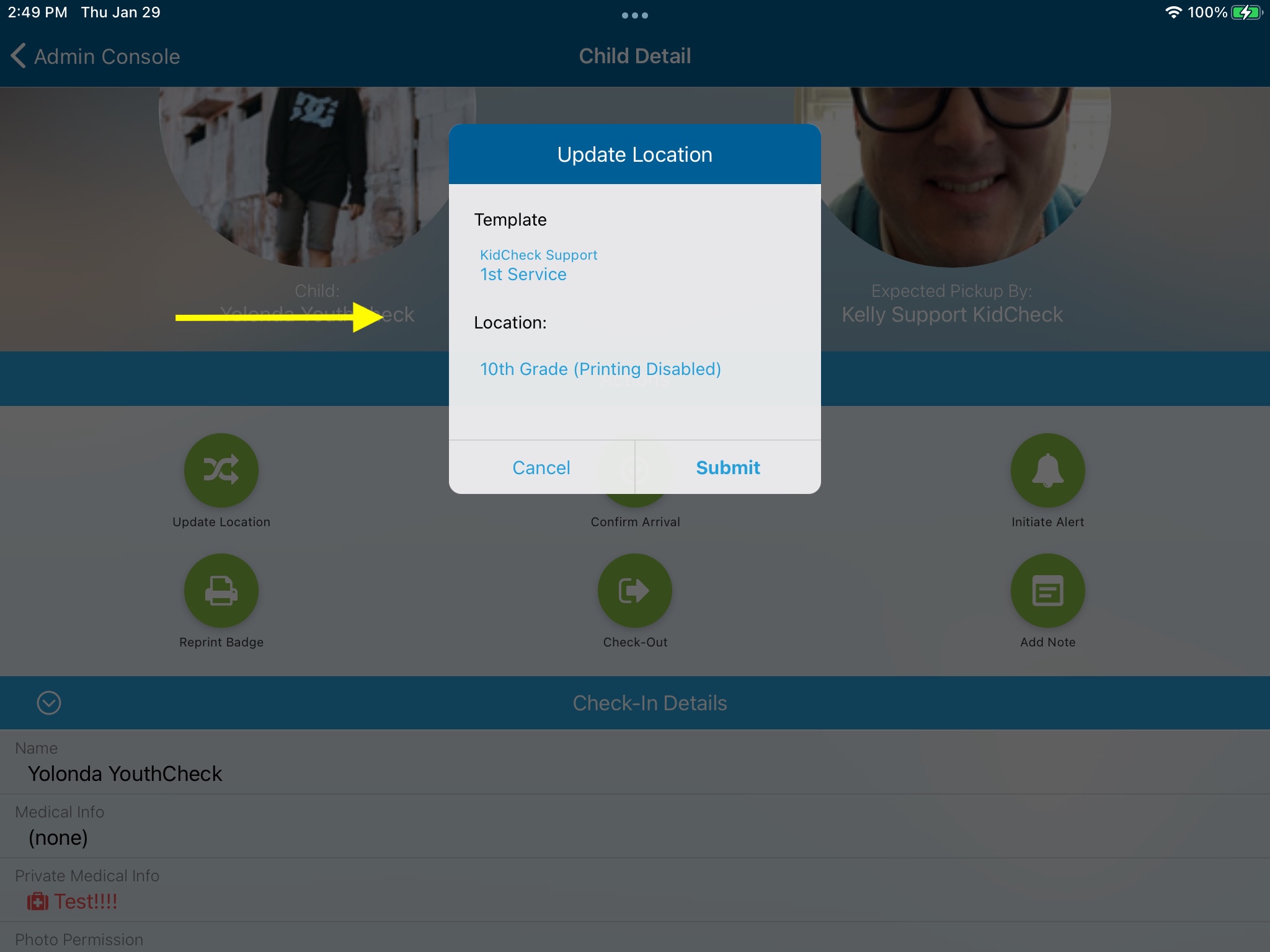 - Update Child Location - Select a child → tap Update Location → choose the new template and location → tap Submit.