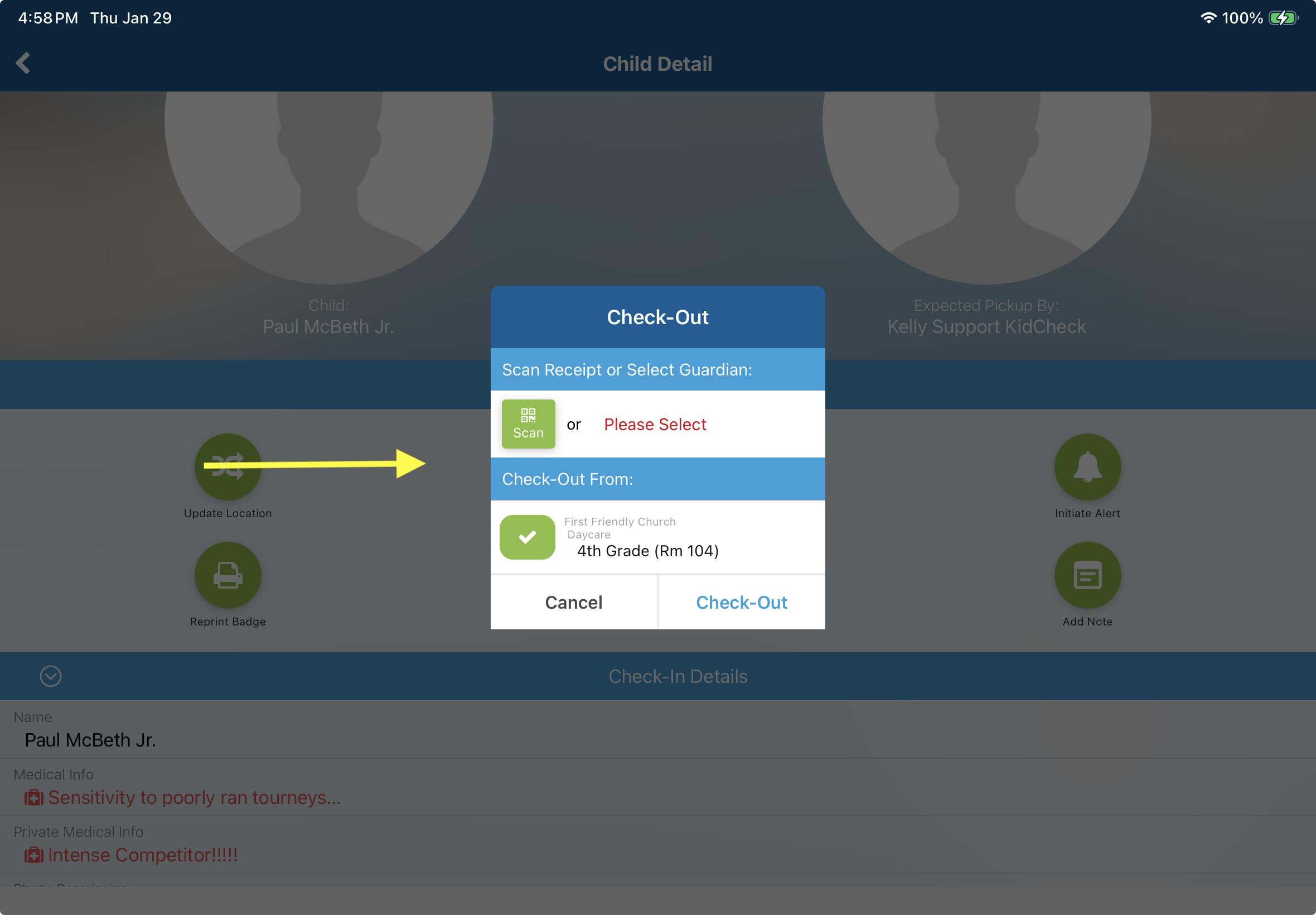 - Process Check-Out - Select a child → tap the green Check-Out button → choose the authorized guardian from the popup → tap Check-Out to complete.