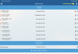 The Admin Console provides quick access to a live roster of checked-in children and several helpful tools.