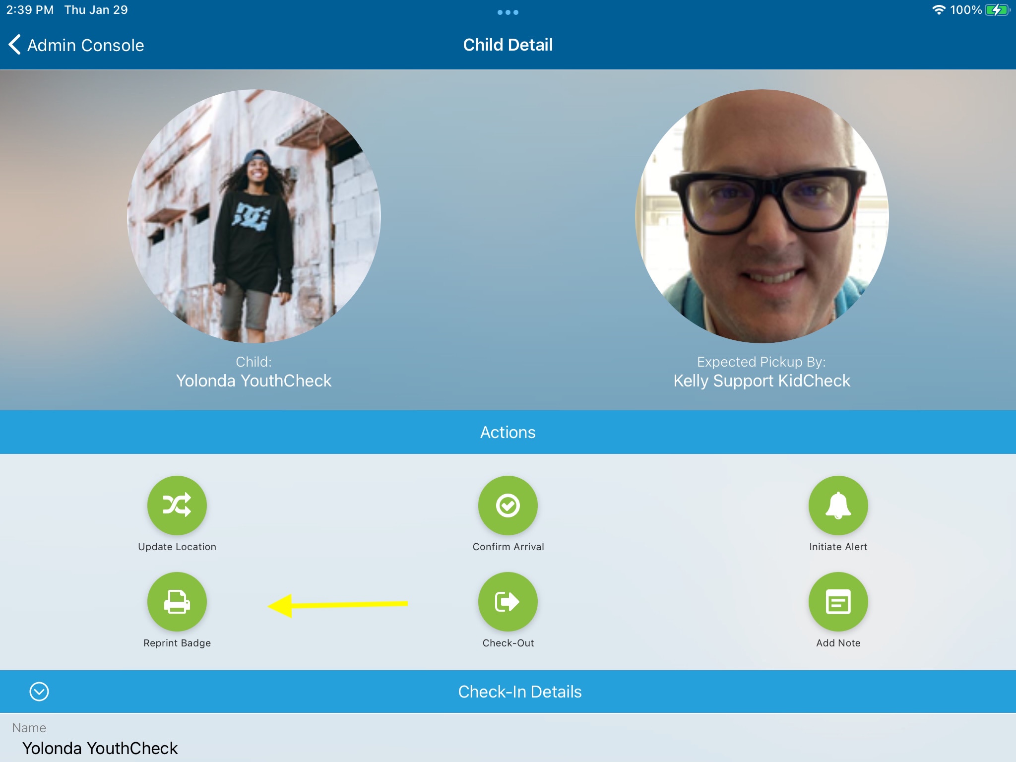 - Reprint Name Badge - Select a child → tap Reprint Badge. Note: Your mobile device must be on the same network as the ExpressHub/printer.