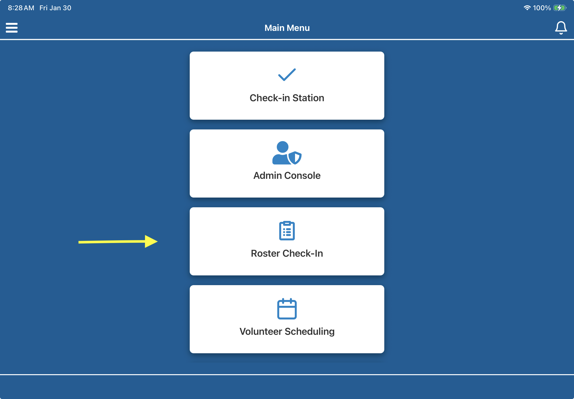 - Open the Admin App and select Roster Check-In from the main menu.